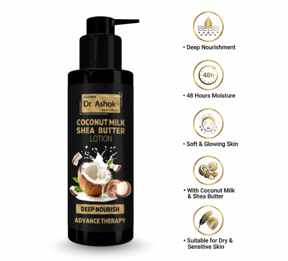 Dr. Ashok’s Coconut Milk & Shea Butter Lotion is specially formulated to provide intense nourishment and long-lasting moisture. Enriched with the goodness of Coconut Milk and Shea Butter, this lotion helps restore skin’s natural softness, improves texture, and prevents dryness. Its lightweight, non-greasy formula absorbs quickly, making it ideal for daily use on all skin types.
